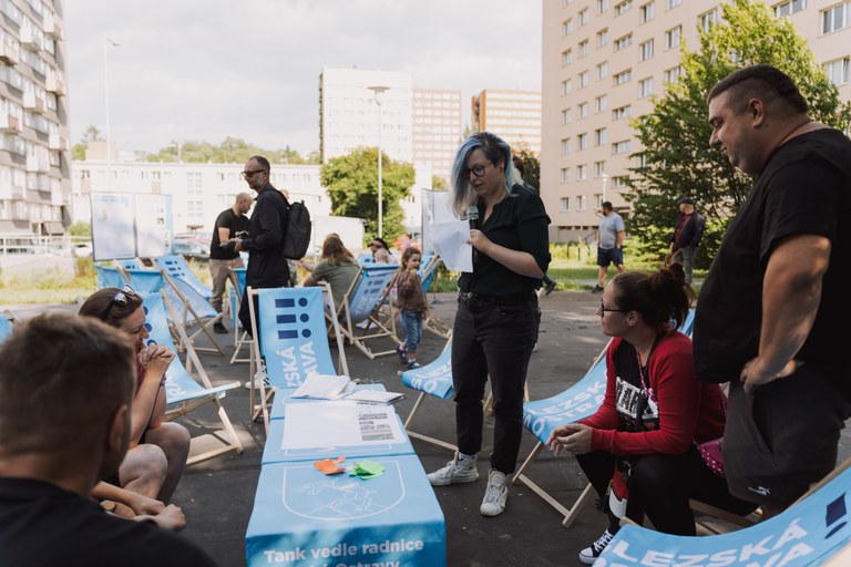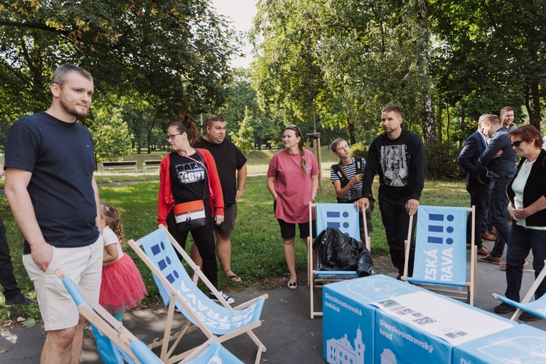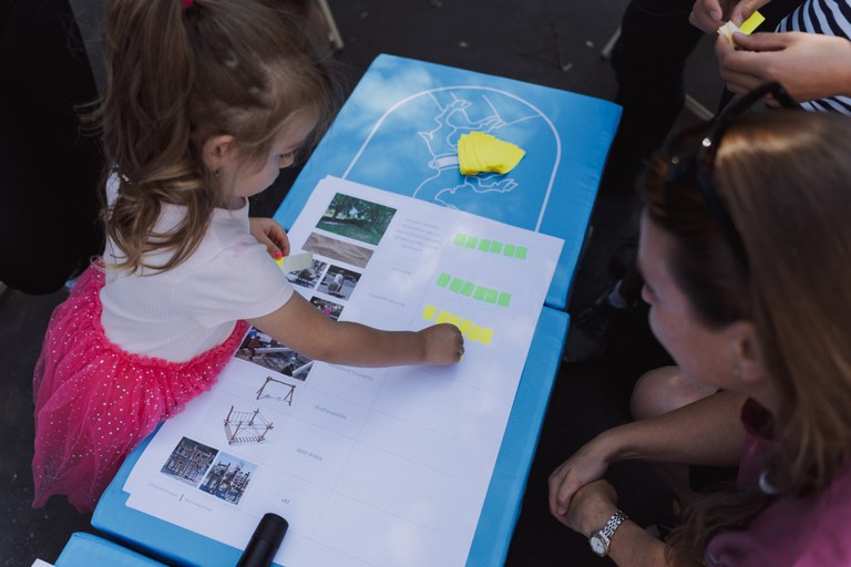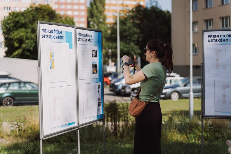 Kromě samotné prezentace připravili architekti pro příchozí i workshop. Rodiče s dětmi mohli pomocí barevných nálepek označit, jaký mobiliář by se měl stát součástí nového hřiště. Nabízely se různé druhy houpaček, pískovišť, dřevěných lavic, piknikový stůl nebo opičí dráha.